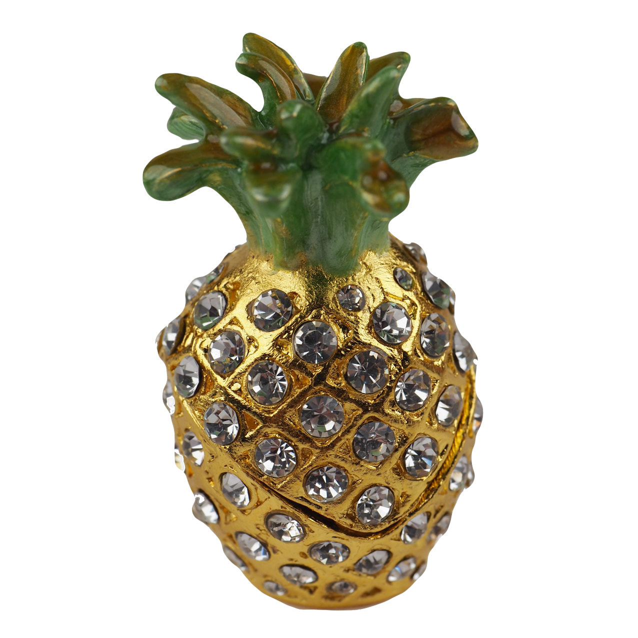 Made of Metal & Diamante and the dimensions are 3cm x 5cm This delightful Crystal Gold Pineapple Trinket Box (LO24143) features an elegant design with a luxurious gold finish, perfect for adding a touch of sophistication to any decor. This functional storage piece includes a hidden compartment, ideal for keeping small treasures securely stored.