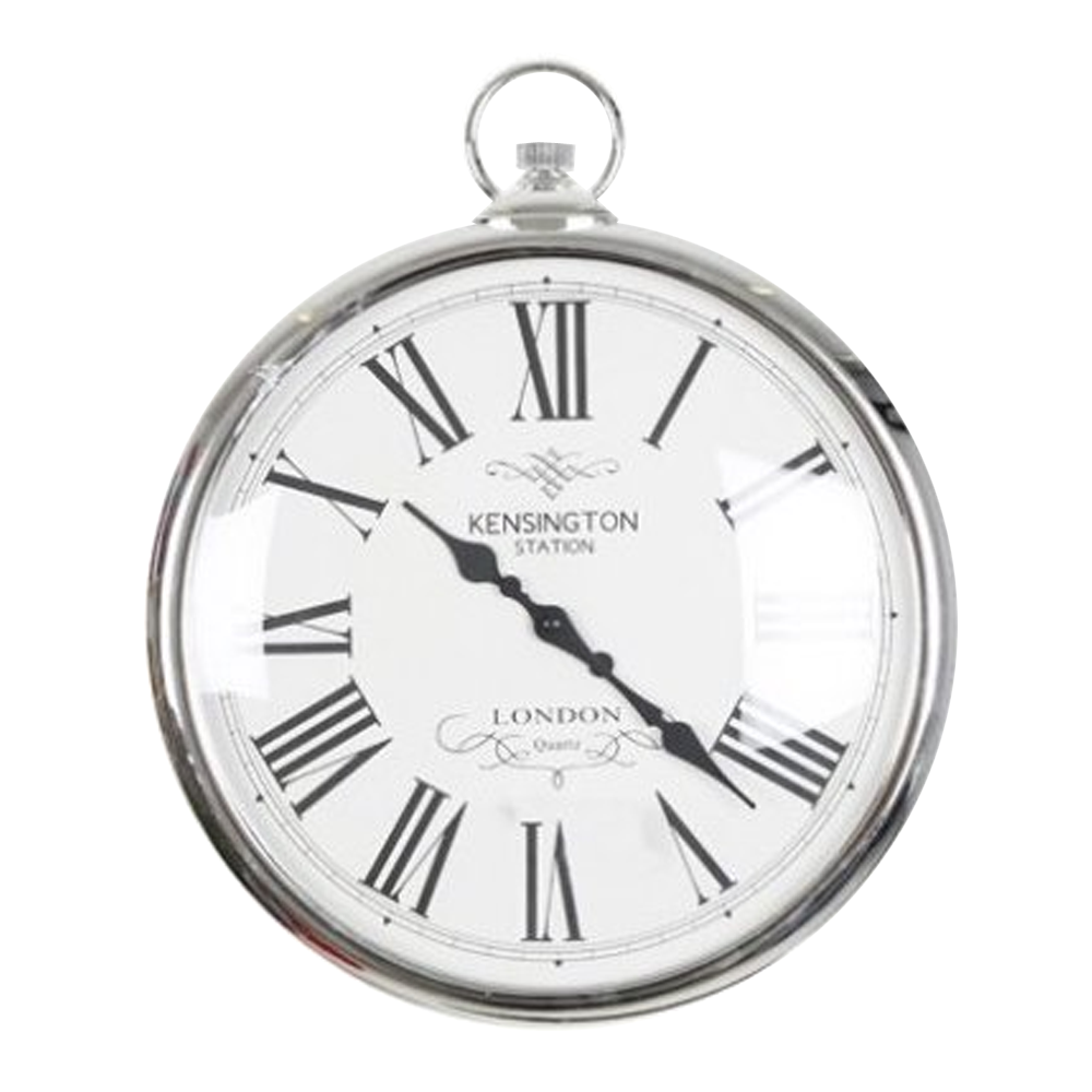 This stylish silver wall clock shaped like a pocket watch with black roman numerals will compliment both classic and modern home interiors.